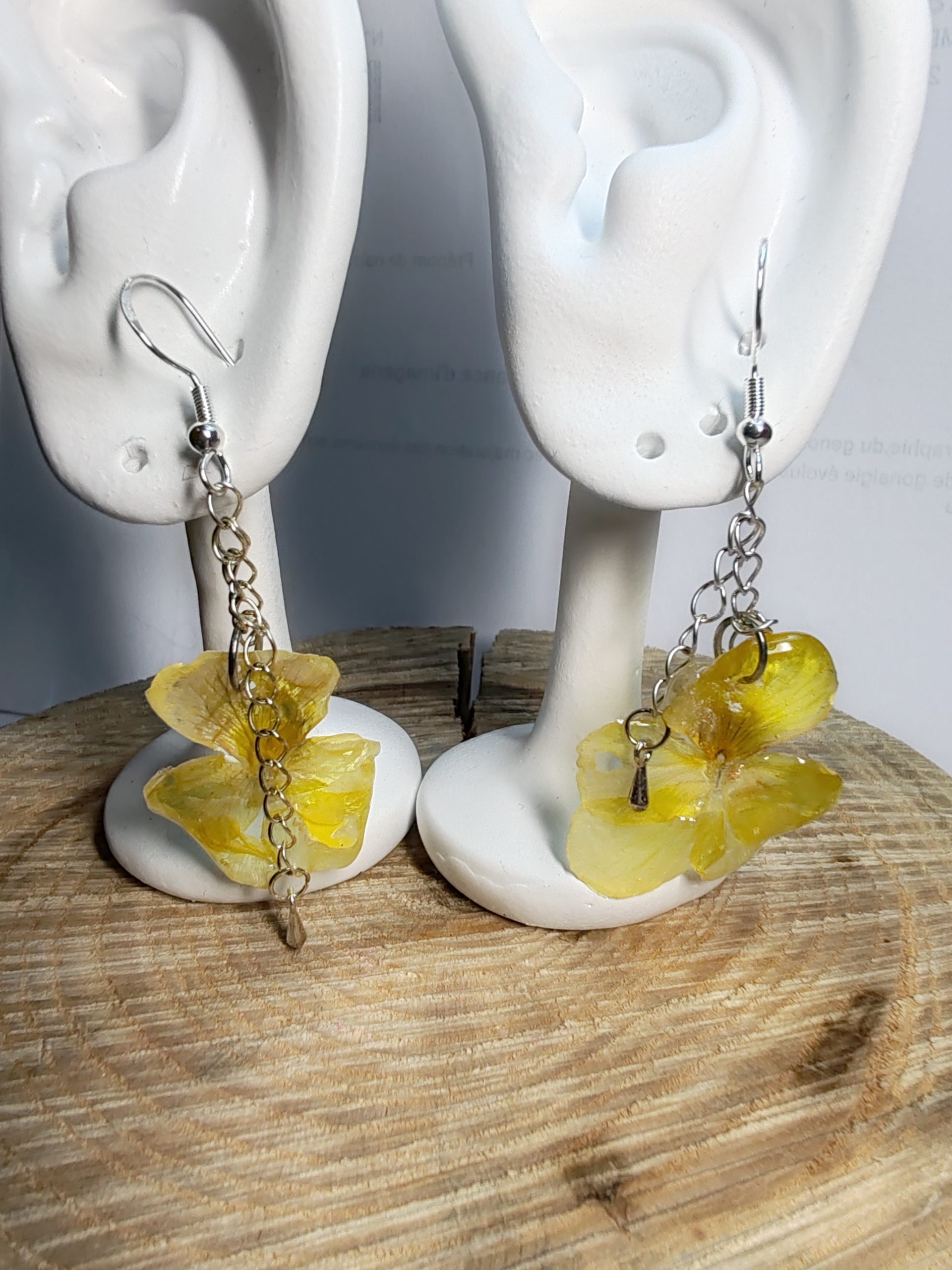 Découvrez l’élégance naturelle de ces boucles d’oreilles confectionnées à partir de véritables pensées jaunes, délicatement encapsulées dans une résine époxy transparente. Chaque fleur est unique, ce qui rend chaque paire totalement originale et authentique.