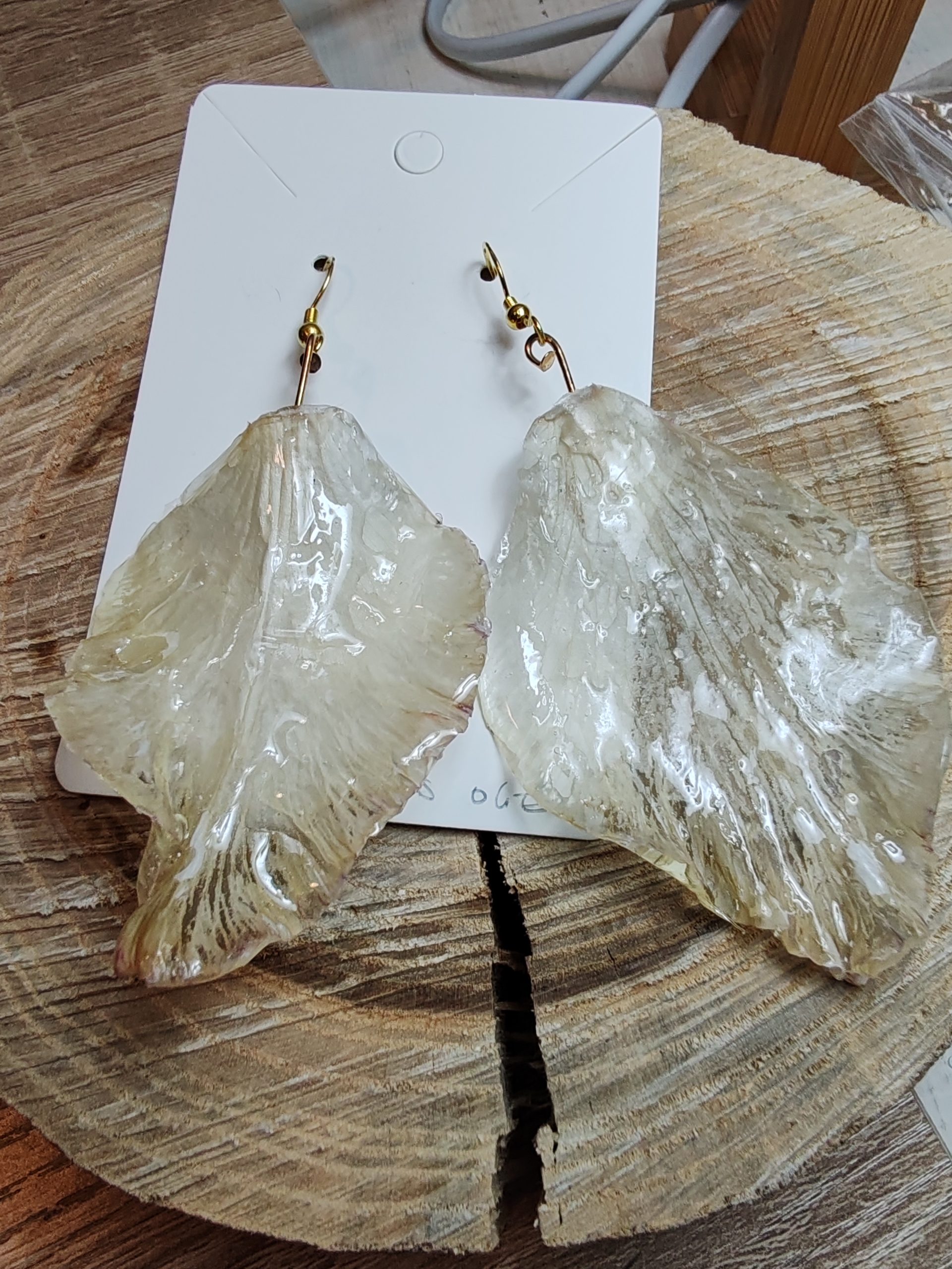 Boucles d’oreilles élégantes avec de véritables pétales de grande fleur blanche, préservés dans la résine. Un bijou pur, lumineux et délicatement naturel.