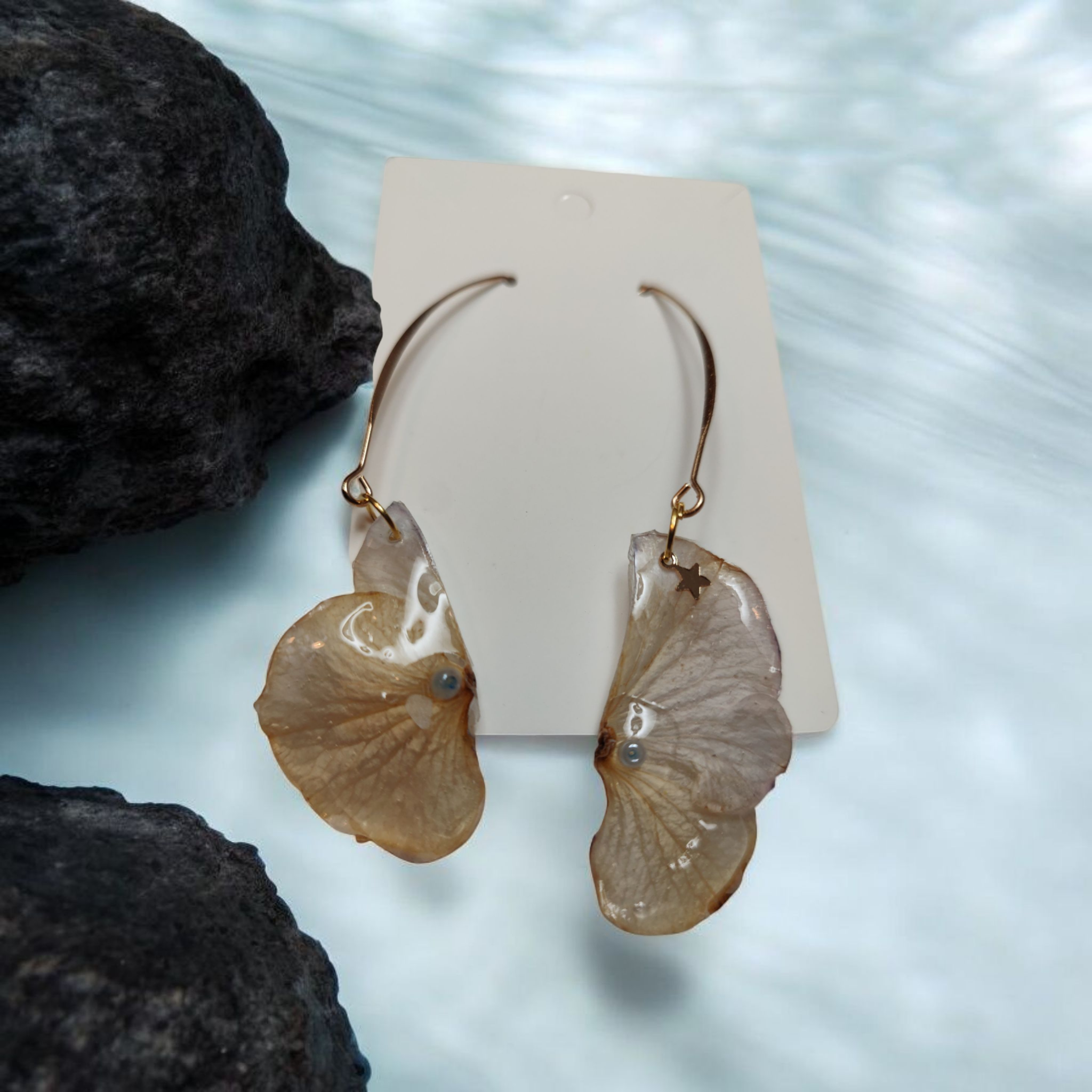 Découvrez un bijou poétique et symbolique avec ces boucles d’oreilles en véritables pétales d’hortensia, soigneusement divisés en deux pour créer une paire parfaitement assortie. Chaque boucle révèle une moitié de la même fleur, préservée dans une résine transparente de haute qualité qui protège ses couleurs naturelles et sa finesse.