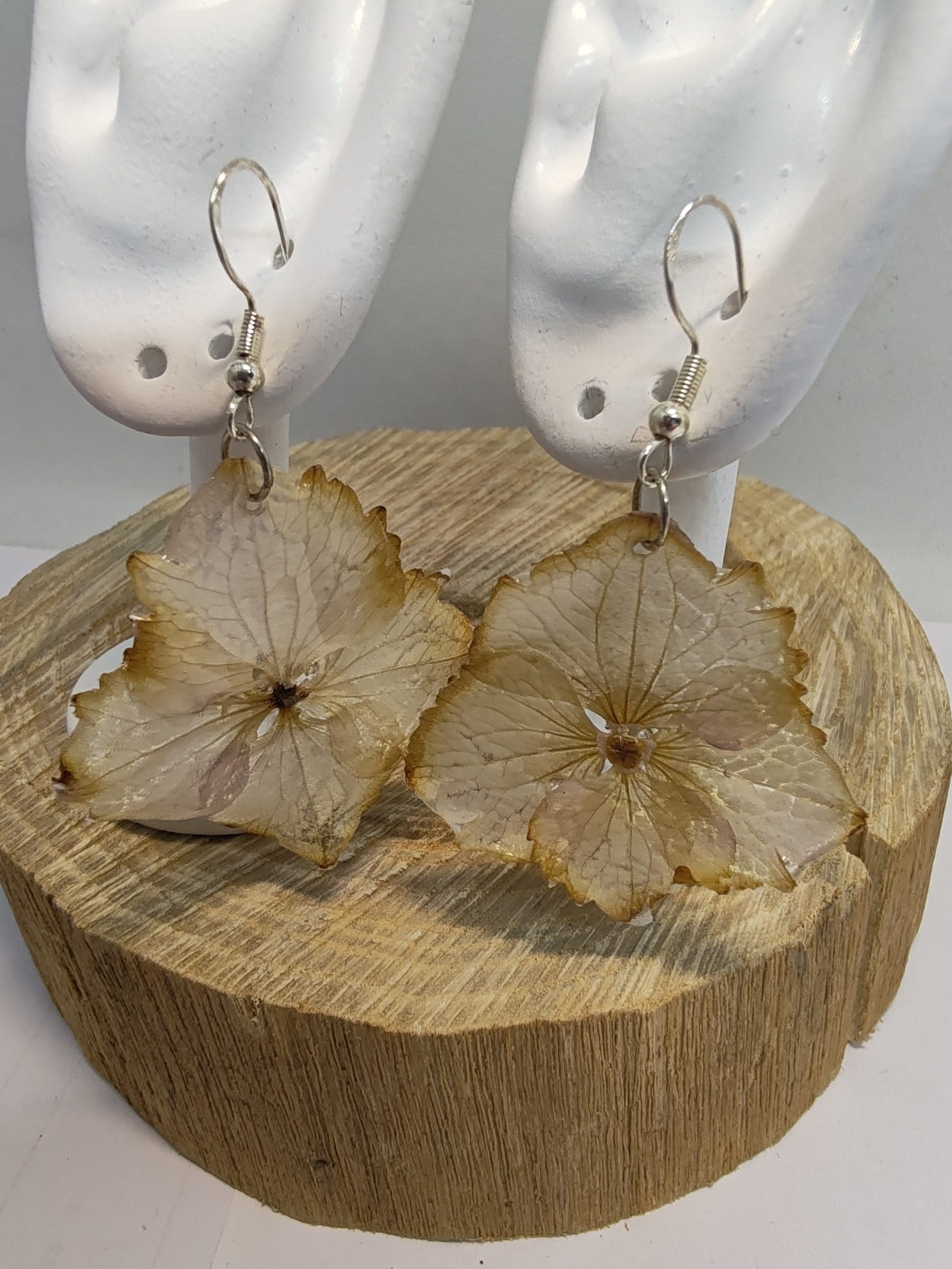 Ces boucles d’oreilles mettent en lumière la délicatesse de véritables fleurs d’hortensia marron clair, soigneusement encapsulées dans une résine transparente. Leurs teintes douces et naturelles apportent un charme subtil et chaleureux, parfait pour un style raffiné et discret.