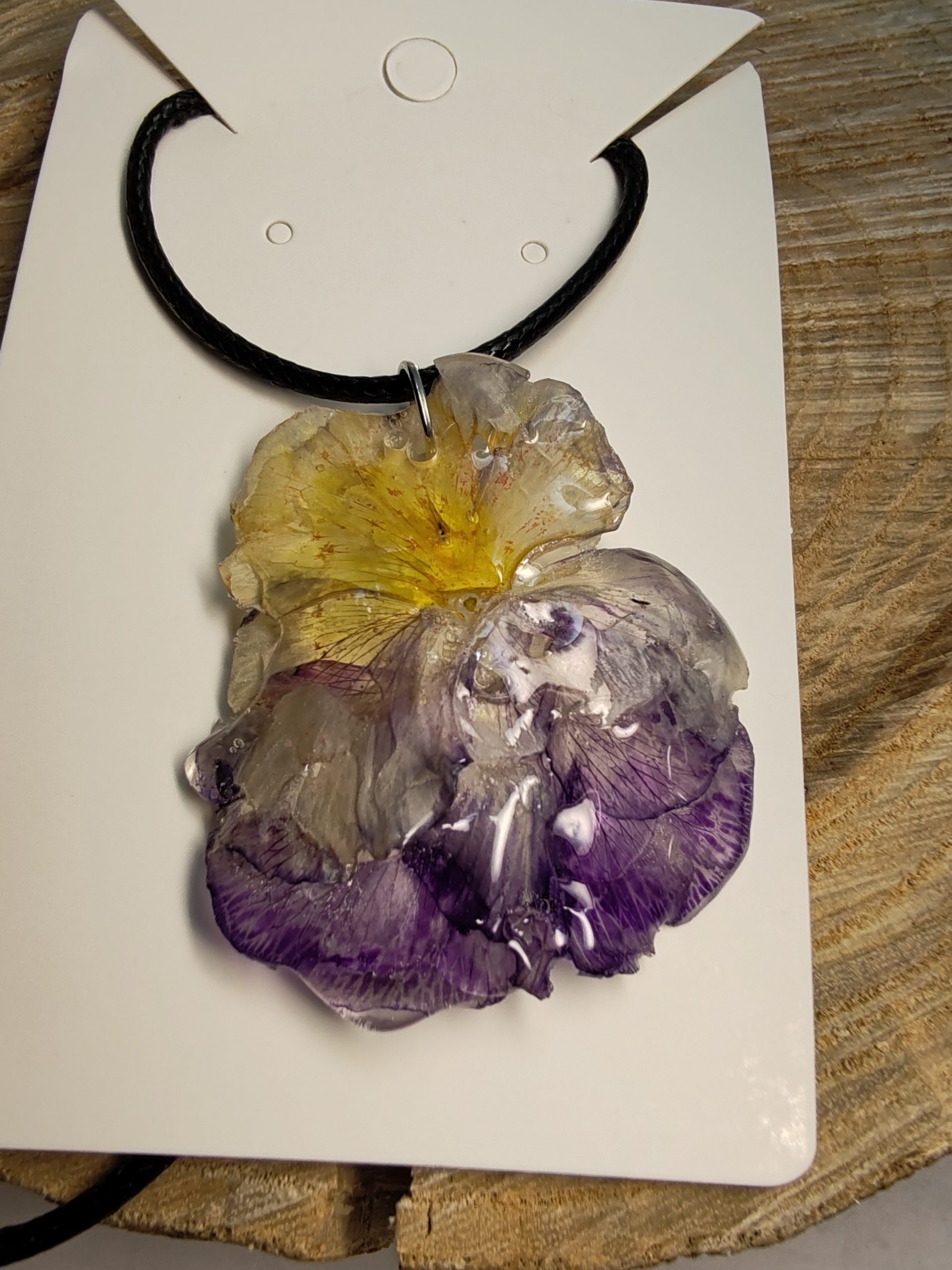 Ce pendentif associe avec douceur les teintes vibrantes du jaune et du mauve pour créer un bijou rempli d’harmonie et de poésie. Réalisé avec de véritables fleurs soigneusement préservées dans une résine transparente, il capture la beauté naturelle des pétales tout en lui offrant une durabilité exceptionnelle.